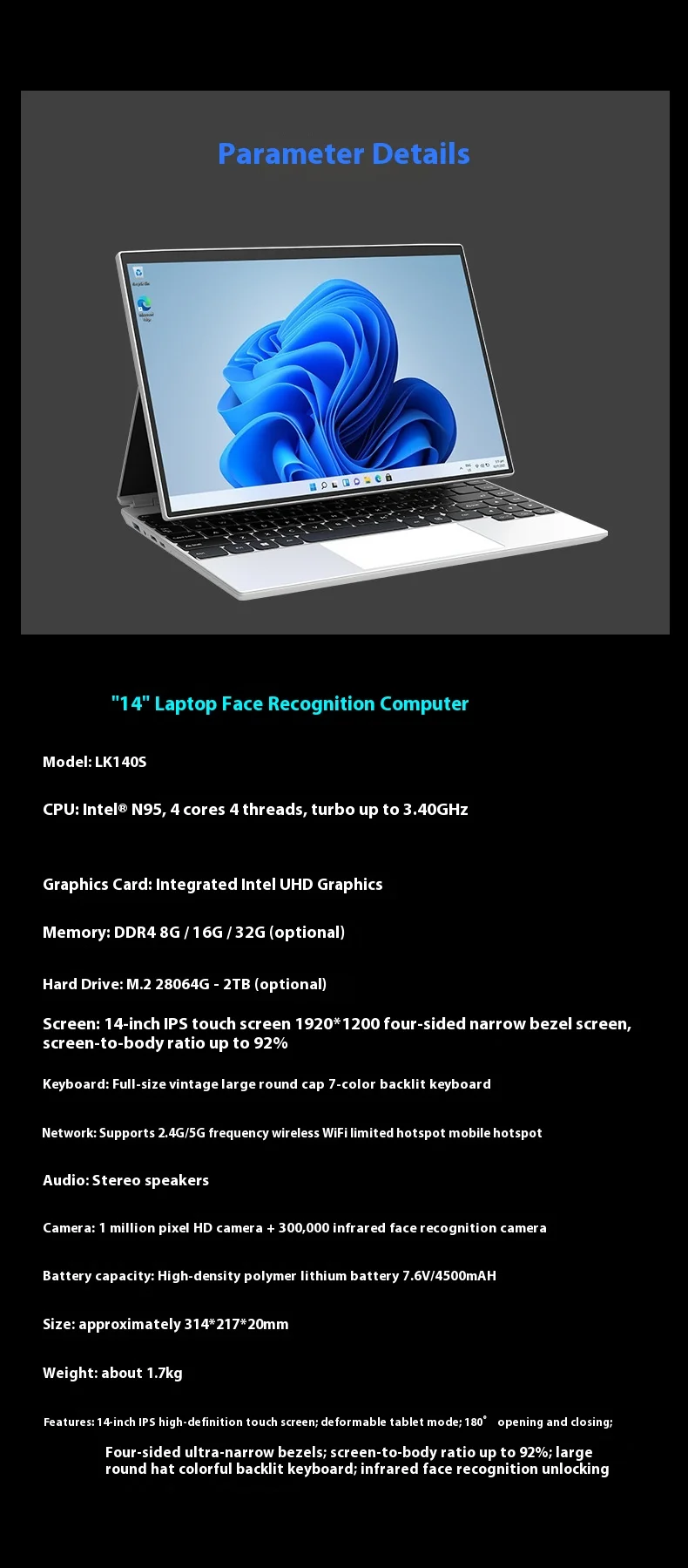 | Feature | 2-in-1 touchpad screen facial recognition |
