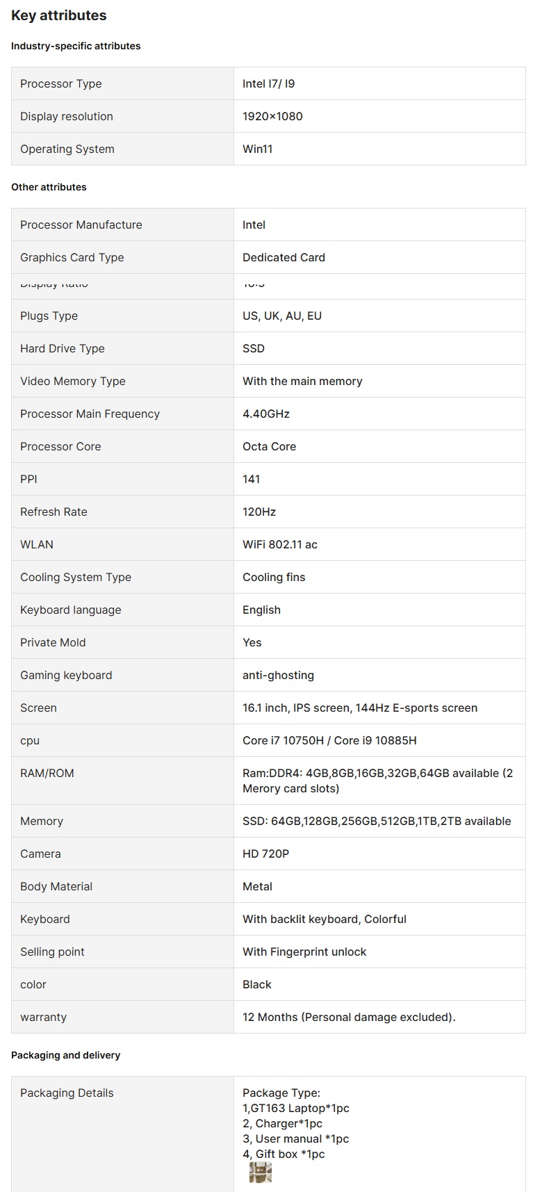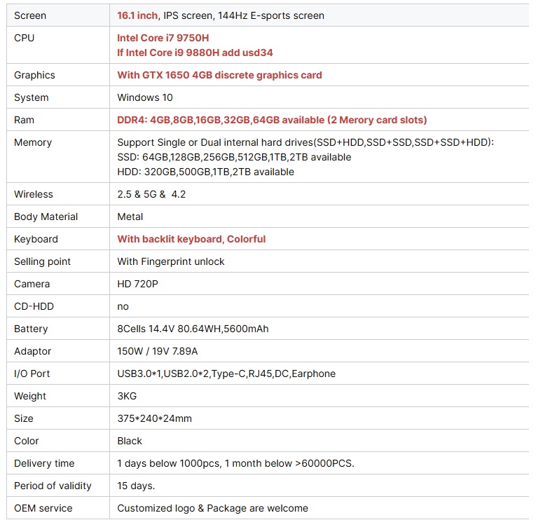 Gaming Laptop Core i9 10885H 32GB 1TB 16.1 Inch IPS Screen 144Hz GTX 1650 Graphic Cards Color: Blac