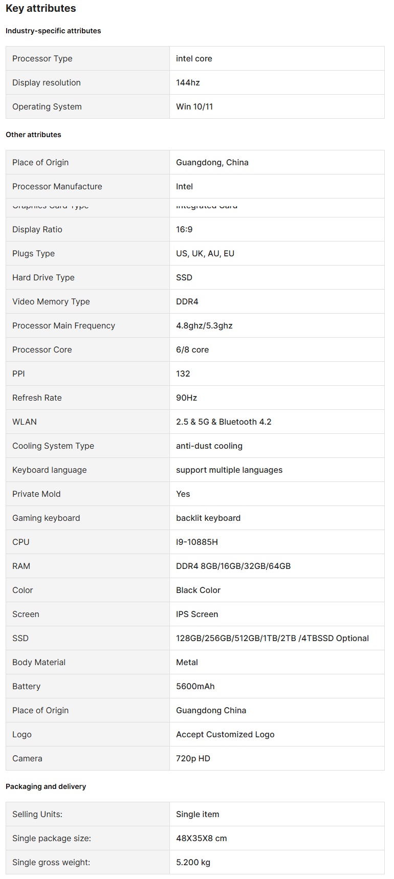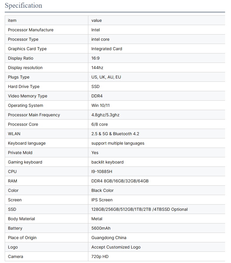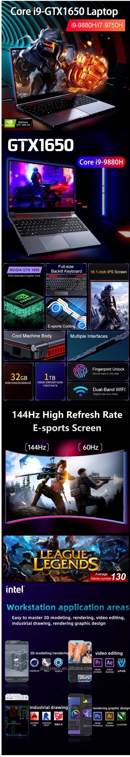 Gaming Laptop Core i9 10885H 32GB 1TB 16 Inch IPS Screen Body Material Metal Color: Black