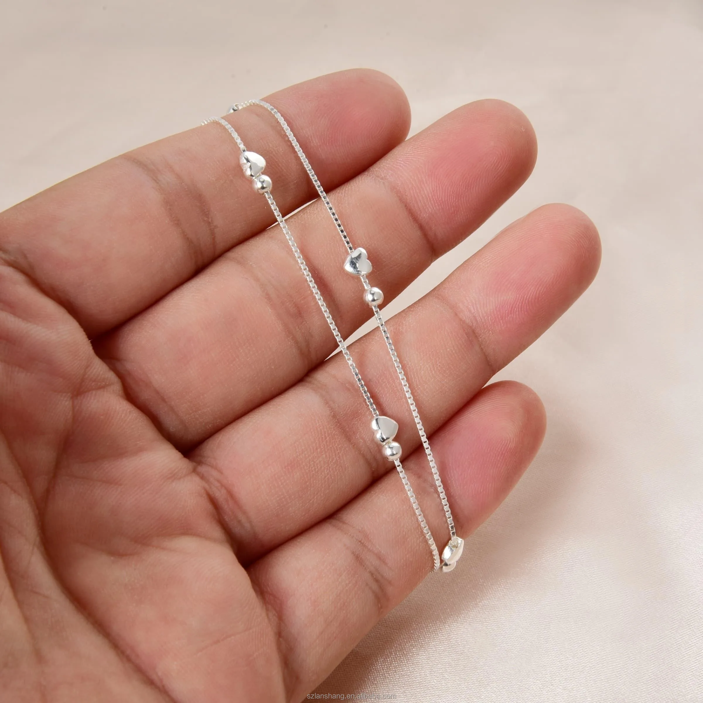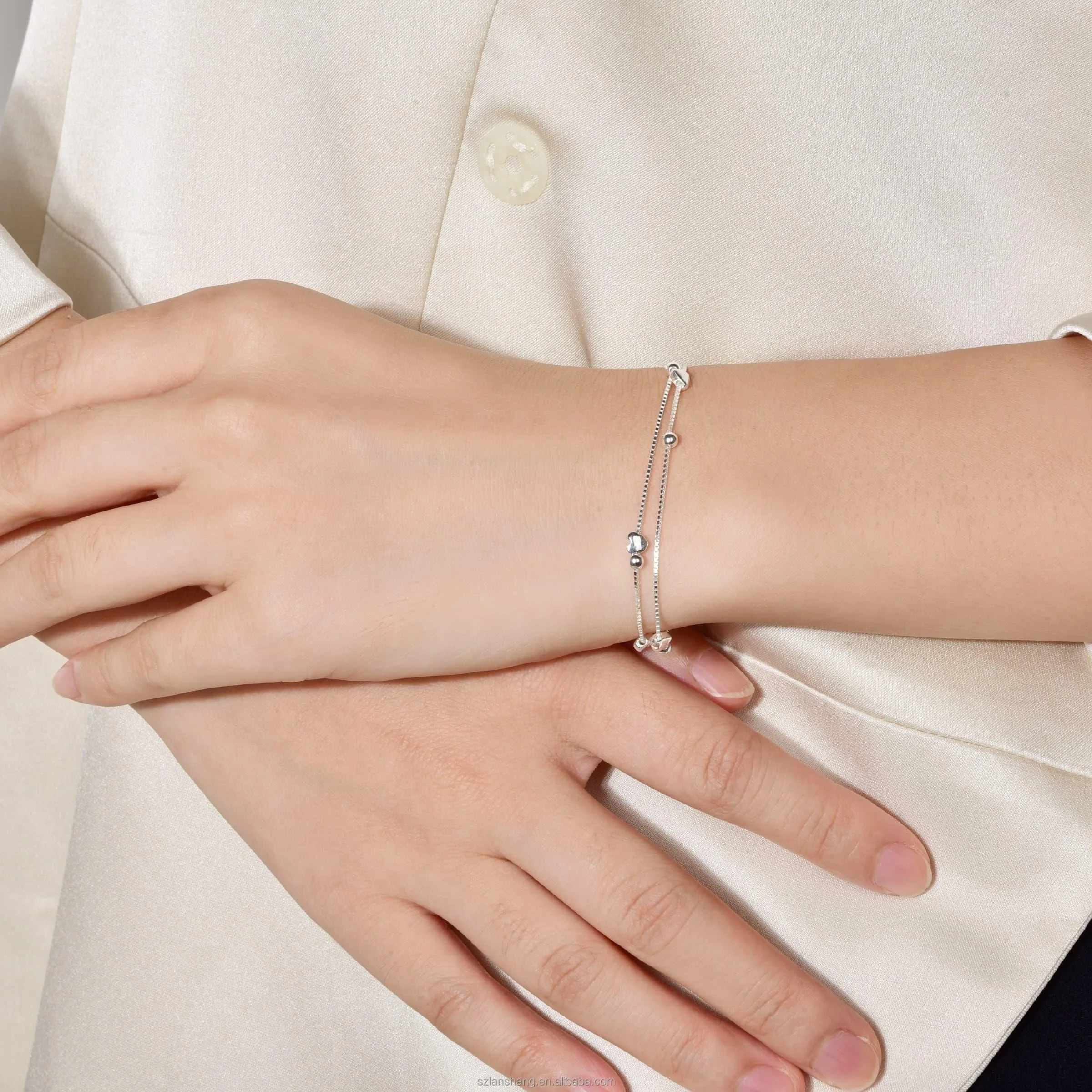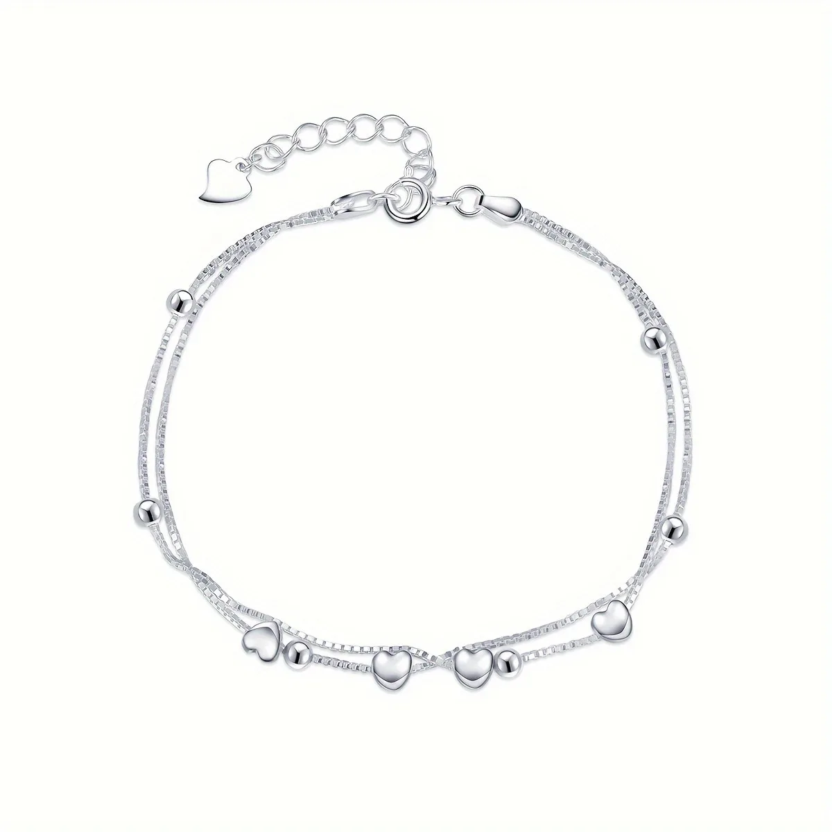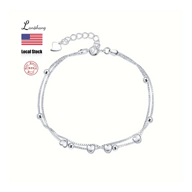 Lanshang S925 Pure Silver Heart-shaped Beads Bracelet Sphere Layered Chain Women’s Jewelry