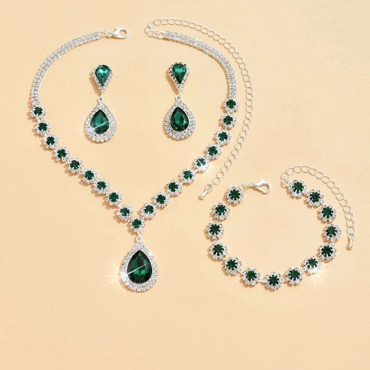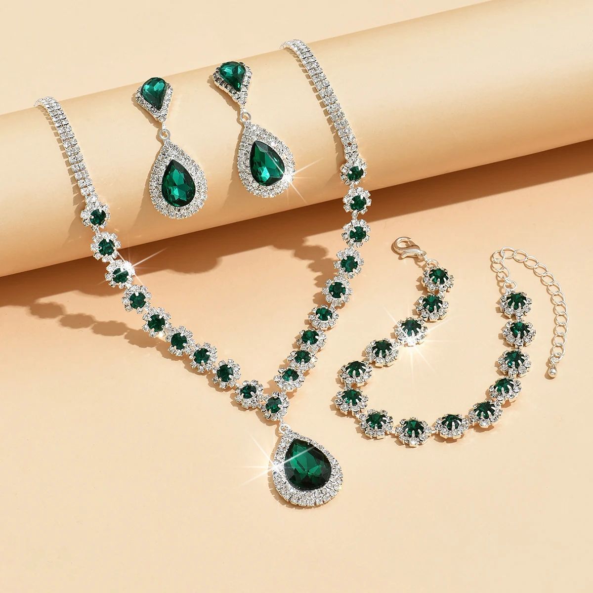 Luxury Wedding Party Women’s Jewelry Set Hole Green Crystal Drop Necklace Earring Bracelet Three-piece Set